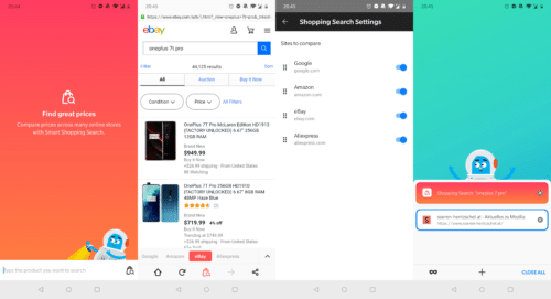 Weiter fällt ein Symbol links von der Adressleiste auf, über welches ein spezieller Shopping-Modus geöffnet werden kann. Hier kann der Nutzer nach einem Produkt suchen und anschließend Preise vergleichen, ohne auf jeder Seite neu den Suchbegriff eingeben zu müssen. Es stehen Google, Amazon, eBay sowie Aliexpress zur Verfügung, der Nutzer kann Anbieter entfernen und auch die Reihenfolge ändern. Der Shopping-Modus wird auch in der Tab-Übersicht speziell dargestellt.