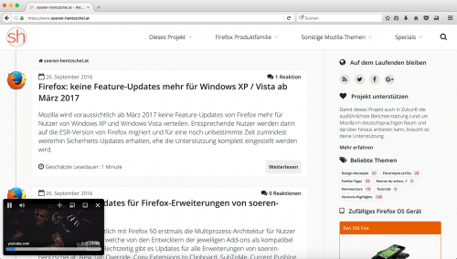 Der Mini-Player besitzt alle relevanten Optionen: Play / Pause, Lautstärke, Anzeige der Videolänge, Möglichkeit zum Schließen oder auch zum Minimieren des Players, zum Verschieben und natürlich auch, um das Video wieder in einem Firefox-Tab zu öffnen.