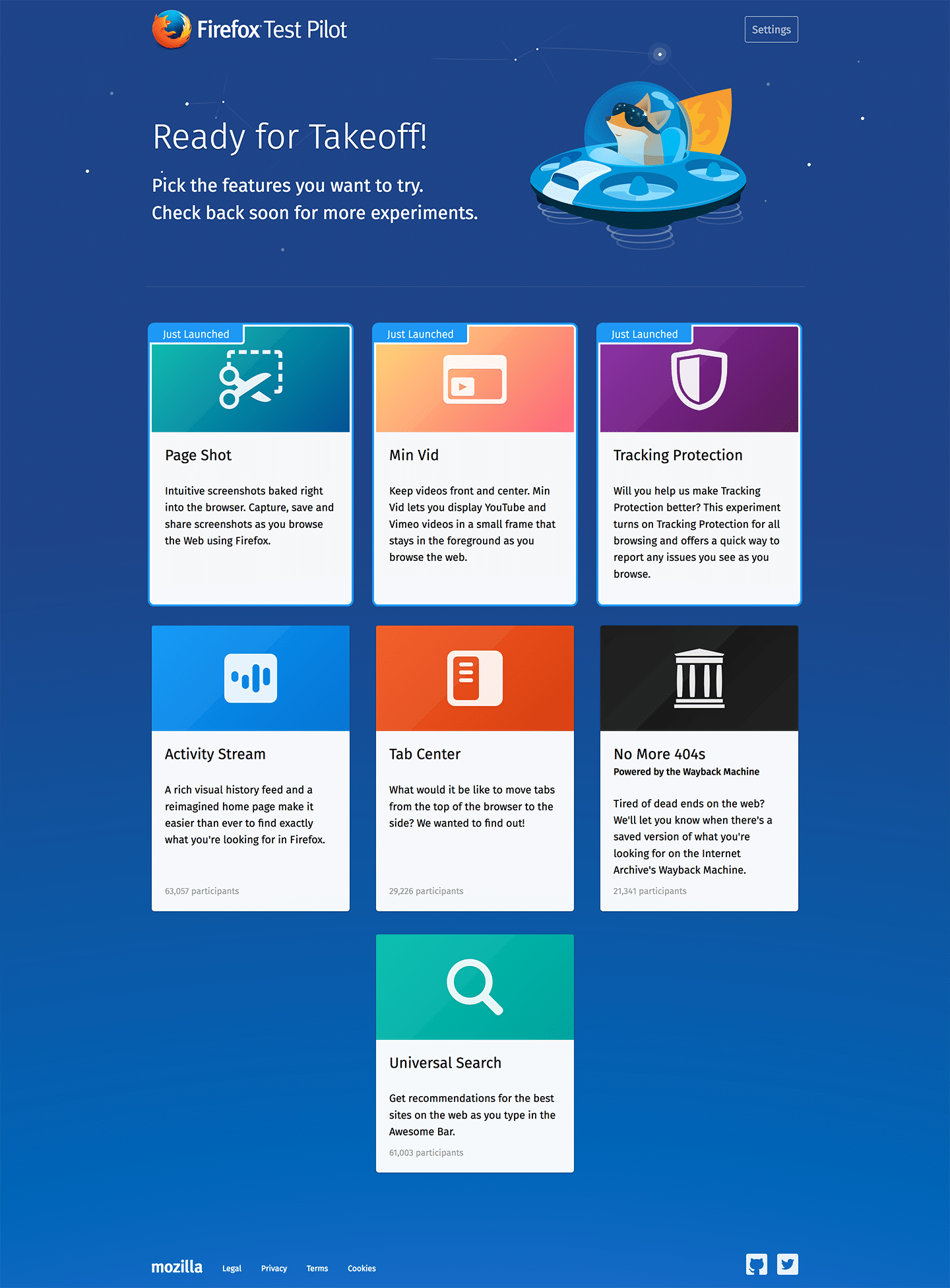 Im Mai hat Mozilla Test Pilot mit den ersten drei Experimenten Activity Stream, Tab Center sowie Universal Search gestartet, welche alle seit dem mehrere Updates erhalten haben. Im August kam schließlich noch No More 404s dazu. Dazu gab es schließlich noch diverse Verbesserungen an Test Pilot selbst in den letzten Wochen.