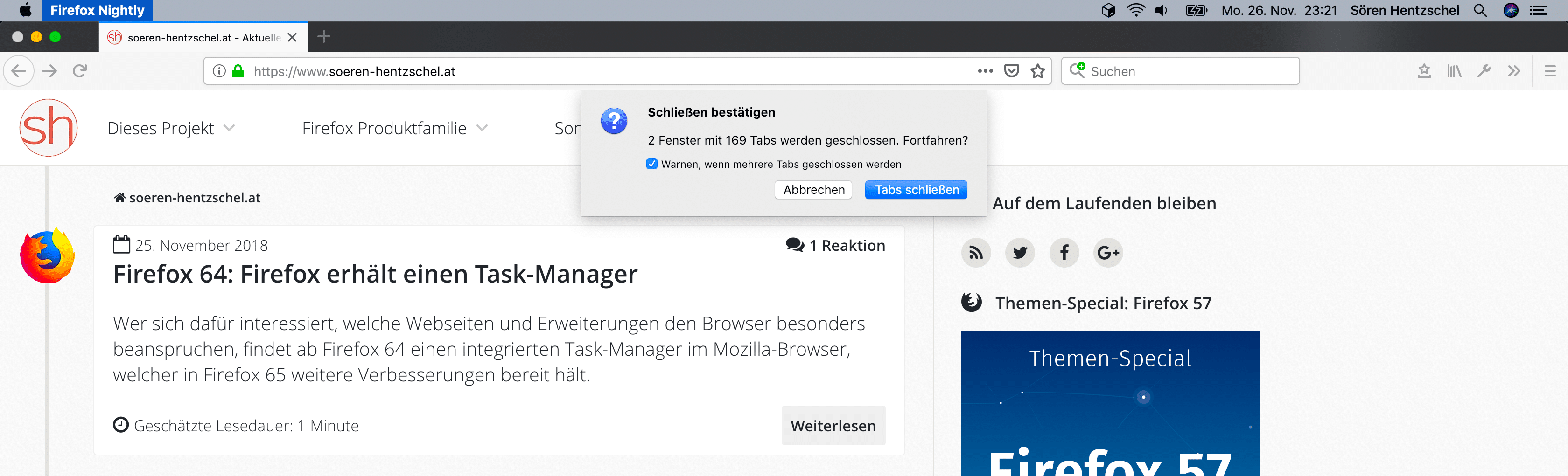 Nicht geschlossene Tabs gehen beim Beenden von Firefox also nicht verloren. Nichtsdestominder kann es ärgerlich sein, wenn man Firefox versehentlich schließt. Gerade am Mac, wo dies per Cmd + Q geschieht, was direkt neben Cmd + W zum Schließen eines einzelnen Tabs liegt, passiert dies Nutzern immer wieder unbeabsichtigt. Gleiches gilt auf Linux für Strg + Q.
