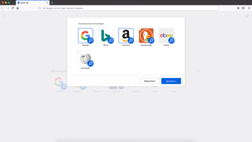 Es kommt standardmäßig eine Kachel von Google dazu – Google ist bekanntermaßen auch die Standard-Suchmaschine von Firefox – und die bereits vorhandene Kachel von Amazon wird geändert. Beide Kacheln fallen dadurch auf, dass sie zusätzlich zum Seiten-Logo auch eine Lupe in der Kachel haben.