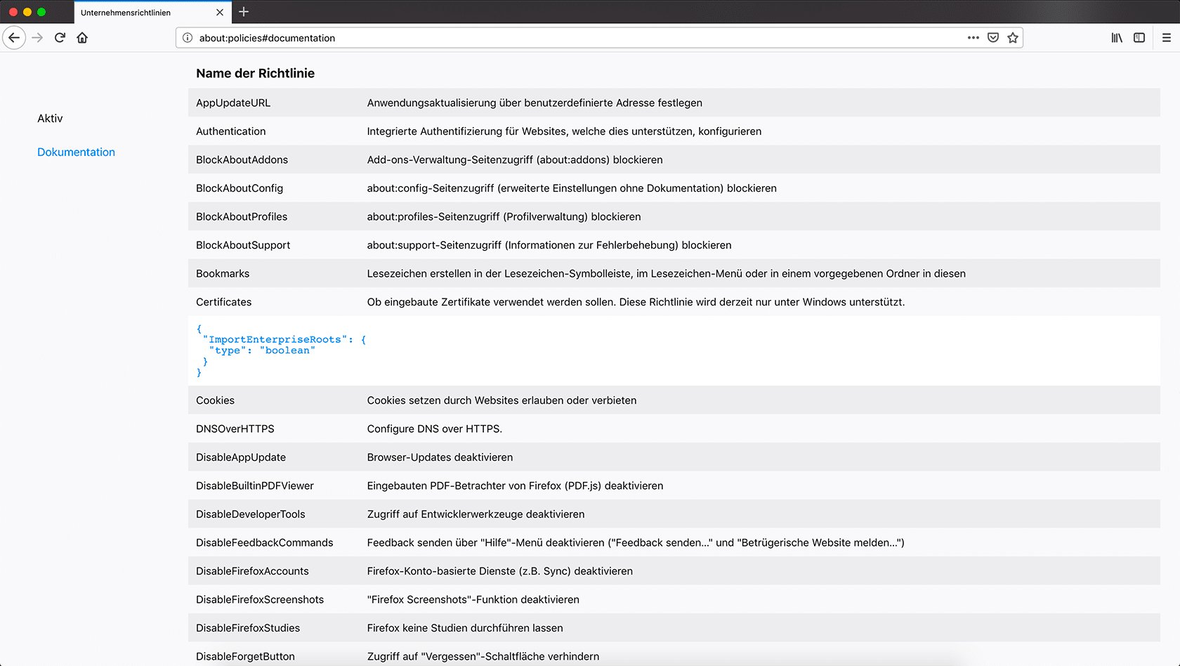Mit about:policies hat Mozilla eine Seite in Firefox implementiert, welche zum einen eine vollständige Dokumentation aller möglichen Enterprise Policies darstellt, zum anderen in einem Tab alle aktiven Policies und in einem weiteren Tab Fehler anzeigt, falls eine Policy fehlerhaft verwendet wird. An der Umsetzung des Designs von about:policies war auch ich beteiligt.