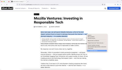 Aus dieser Zusammenarbeit entstanden ist Firefox Translations. Die Firefox-Erweiterung von Mozilla erlaubt die Übersetzung vollständiger Websites direkt im Browser.