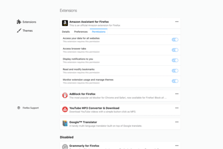 Im neuen Listen-Design, welches auf den ersten Blick nur leicht verändert ist, bleibt mehr Platz für die Beschreibungen, weil die Buttons zugunsten eines Drei-Punkte-Menüs verschwunden sind, wie es bereits an anderen Stellen von Firefox vorkommt. Deaktivierte Erweiterungen werden von aktivierten Erweiterungen durch eine Überschrift klarer voneinander getrennt.