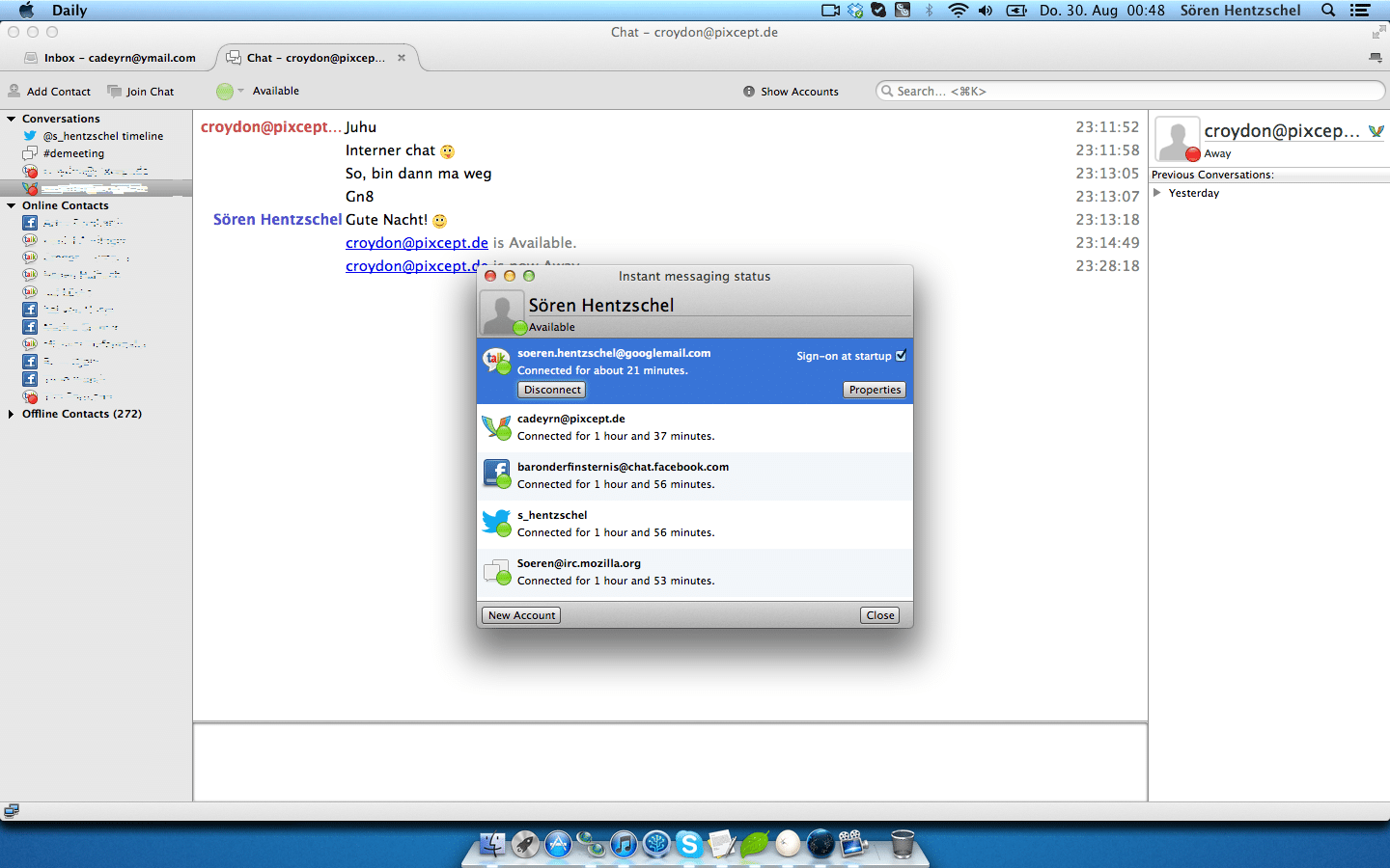 Die Verwendung des Instant Messaging-Features erfolgt für Facebook, Google und XMPP/Jabber auf die selbe Weise. Auf der linken Seite sieht man alle seine Kontakte gruppiert nach den verfügbaren Kontakten sowie denen, die gerade nicht online sind. Ganz oben werden alle aktiven Gespräche aufgelistet, welche mit einem Klick auf das x-Symbol wieder geschlossen werden können. Ein roter Punkt auf dem Symbol des verwendeten Netzwerkes der Kontakte signalisiert dabei, dass diese Person gerade abwesend ist.