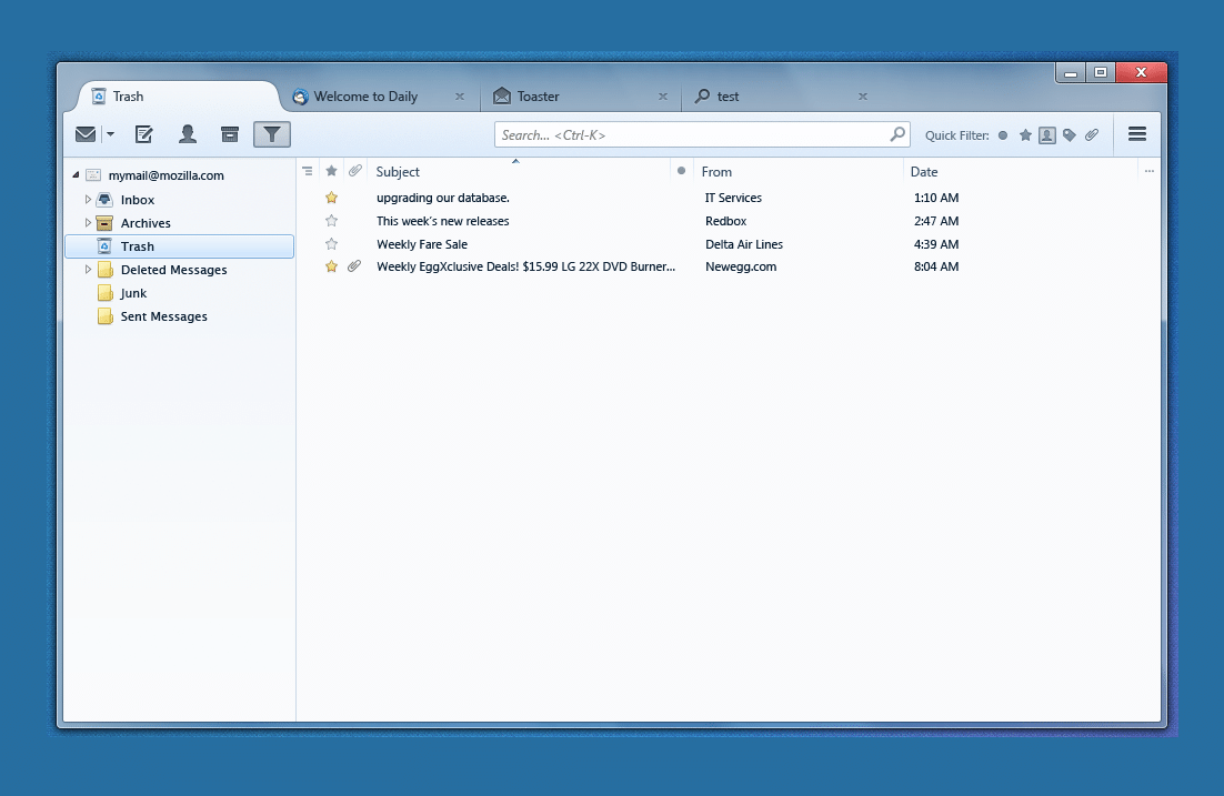 Und wie könnte Thunderbird in Zukunft aussehen? Das zeigt folgendes Mockup. Auffälligkeiten: Menübutton in der Haupttoolbar, Schnellfilterleiste in diese integriert, nur noch ein Suchfeld, neue Icons, diese ohne Beschriftung. Was davon wir wann in welcher Form sehen werden und was nicht, wird die Zukunft zeigen.