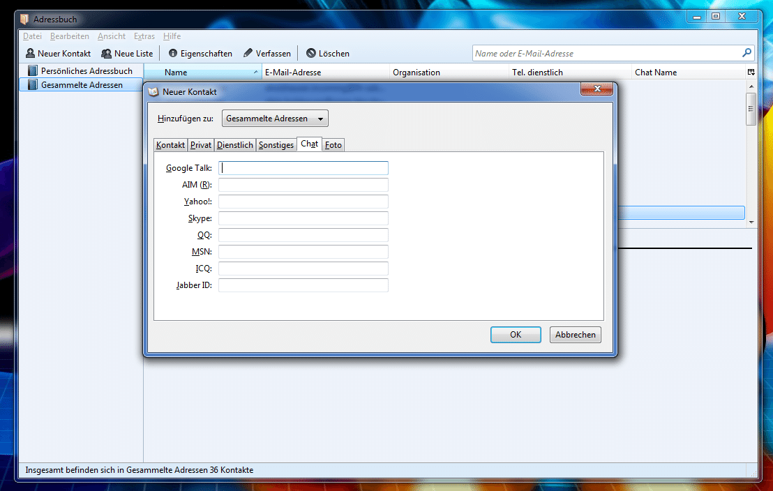 Mit Thunderbird 13 wurde versteckt bereits eine Instant Messaging-Funktionalität eingeführt. Diese ist ab Thunderbird 15 standardmäßig aktiviert und hat seit dem viele Verbesserungen erfahren. So wird neben IRC, Twitter, Facebook und GTalk jetzt auch ganz allgemein XMPP unterstützt und die Konversationen können nun wie auch die E-Mails über die Suchfunktion durchsucht werden; ebenfalls wie bei den E-Mails werden die Suchbegriffe in den Ergebnissen dabei besonders gekennzeichnet. Desweiteren bietet das Adressbuch diverse Felder für Chat-Daten wie GTalk, Jabber, ICQ, MSN oder Skype.